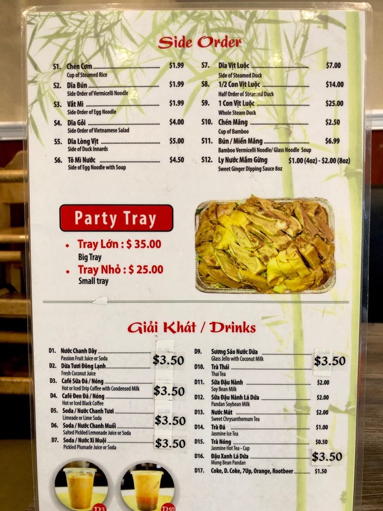 “ There's a strong smell when you walk into the restaurant, it's the smell of the bamboo soup, you 'll get used to it. Seat yourself. Go for V3-V5 combos, you get bamboo soup and duck salad. The duck salad is to die for, get just salad, V1 if you're not a fan of bamboo shoots. The V6 braised fried duck is delicious, frying it gives it another layer of flavor. V9 & V10 are available on weekends only I think. Good to know: -Cash only. -The waitress is not friendly. Minus 1 star. -Beware if you don't speak Vietnamese, the waitress will be extremely unfriendly! ”