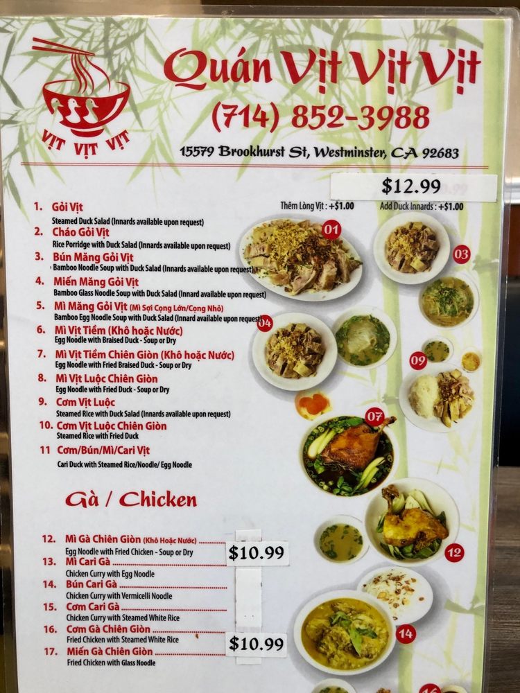 Welcome to Quan Vit Vit Vit, nestled at 15579 Brookhurst St, Westminster, CA, where the magic of Vietnamese cuisine comes alive, specializing in duck dishes. This eatery emphasizes the delights of its namesake, with "vit" meaning duck, celebrated in every dish they serve.